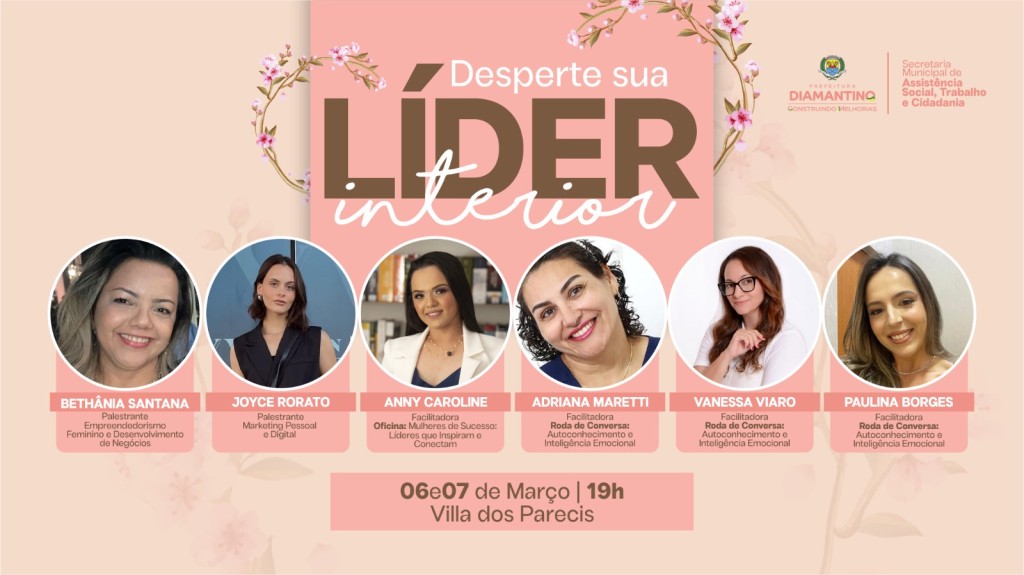 A Prefeitura Municipal de Diamantino, por meio da Secretaria Municipal de Assistência Social, Trabalho e Cidadania, divulgou a programação do evento ‘’Desperte sua Líder Interior’’, que ocorrerá nos dias 06 e 07 de março no espaço Villa dos Parecis. O evento, que é totalmente gratuito, contará com palestras, workshops, roda de conversas e atividades exclusivas durante os dois dias.