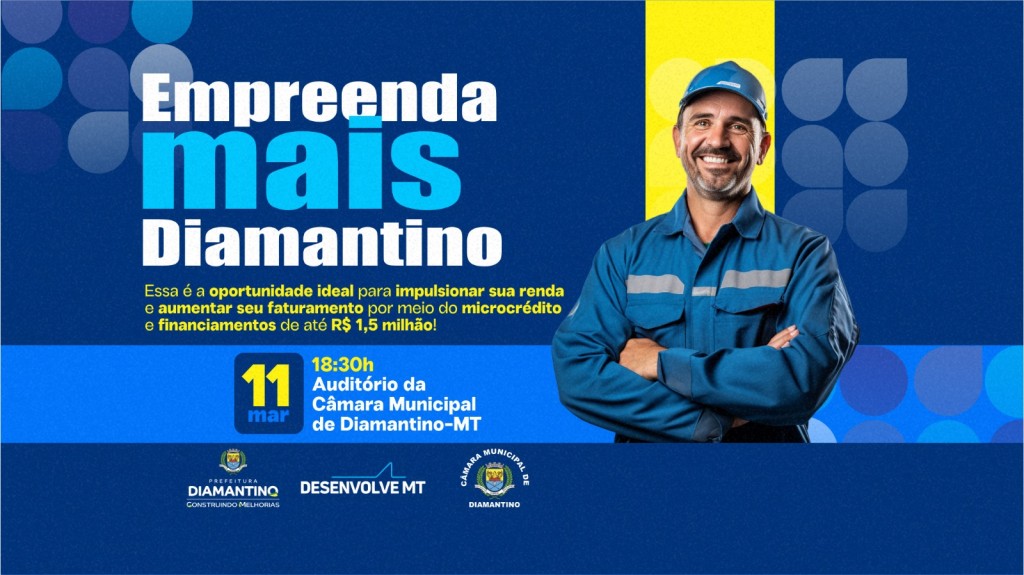 A Prefeitura de Diamantino, em parceria com a Desenvolve MT e a Câmara de Vereadores, promove nesta terça-feira (11.03), às 18h30, uma palestra sobre as linhas de crédito disponíveis para empresários interessados em expandir seus negócios. Durante o evento, também será renovado o convênio com a Desenvolve MT, permitindo que o município conte com um agente de crédito local para atender os empreendedores e microempresários locais.