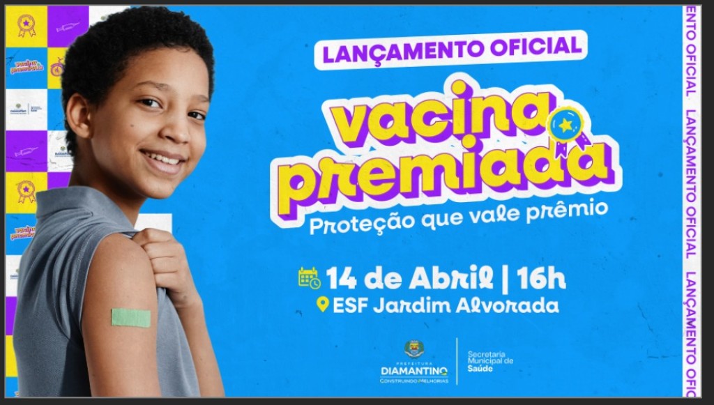 A Prefeitura de Diamantino, por meio da Secretaria Municipal de Saúde, convida toda a comunidade diamantinense para o lançamento oficial do projeto “Vacina Premiada – Proteção que Vale Prêmio”, que acontecerá na terça-feira, dia 14 de abril, a partir das 16h, na ESF Jardim Alvorada.