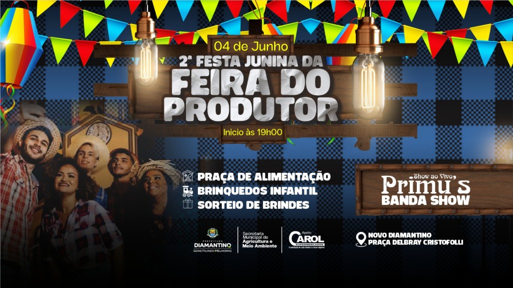 A Prefeitura de Diamantino, por meio da Secretaria de Agricultura e Meio Ambiente, convida toda a comunidade para participar da 2º Festa Junina do Produtor, que será realizada no próximo dia 4 de junho (terça-feira), a partir das 19h, na praça Delbray Cristofolli, no Novo Diamantino.