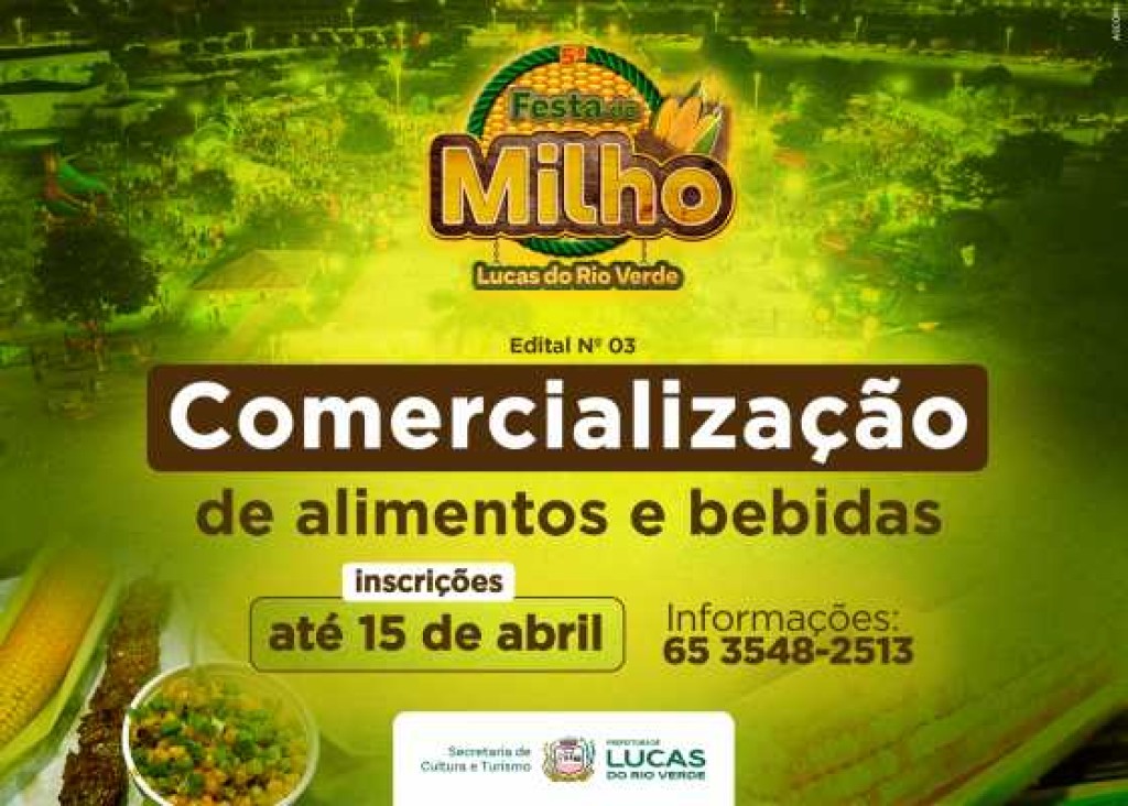 A Prefeitura de Lucas do Rio Verde, por meio da Secretaria de Cultura e Turismo, informa que as inscrições para participar do Edital Nº 003/2026, que trata da exploração comercial de alimentos e bebidas na praça de alimentação da 5ª Festa do Milho, seguem até o dia 15 de abril. O evento será realizado nos dias 9 e 10 de maio.