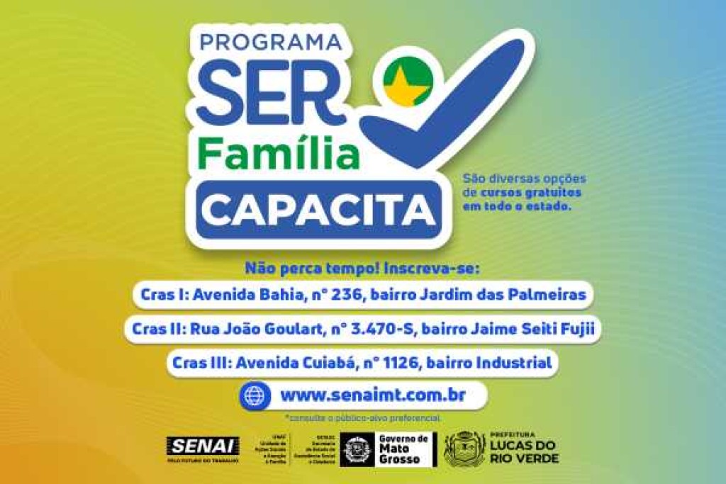 A Secretaria de Assistência Social e Habitação de Lucas do Rio Verde informa que os cursos de Desenvolvedor Mobile Android, Almoxarife e Assistente Contábil Financeiro estão com inscrições abertas. As capacitações são gratuitas e oferecidas pelo programa Ser Família Capacita, do Governo do Estado de Mato Grosso, através da Secretaria de Estado de Assistência Social e Cidadania, em parceria com o Senai e Prefeitura de Lucas do Rio Verde, por meio da Secretaria Municipal de Assistência Social e Habitação.
