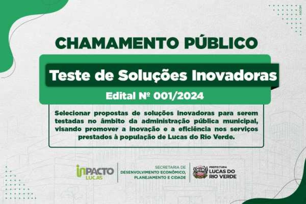A Prefeitura de Lucas do Rio Verde, por meio da Secretaria de Desenvolvimento Econômico, Planejamento e Cidade e departamento de inovação, está com inscrições abertas, para o Chamamento Público para Teste de Soluções Inovadoras, por meio do Edital nº 001/2024.