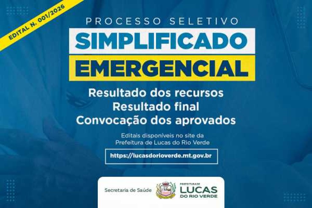 Já estão disponíveis no site da Prefeitura de Lucas do Rio Verde, os editais com o resultado final e a convocação dos candidatos aprovados no Processo Seletivo Emergencial (Edital n. 001/2026).