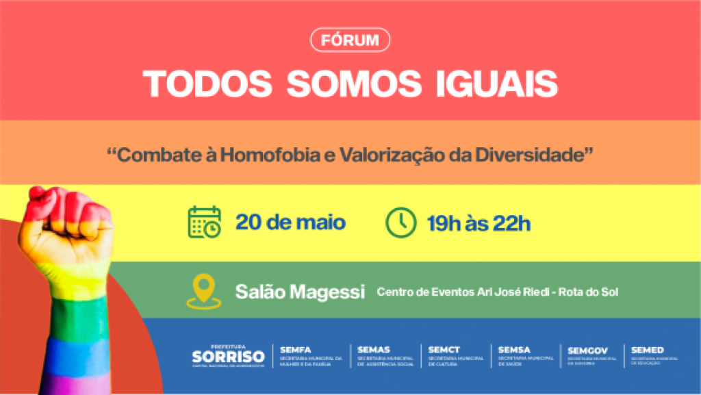 “O combate à homofobia como compromisso social” é o tema deste ano do 4.º Fórum de Combate à Homofobia. O evento será realizado no dia 20 de maio no Auditório Magessi do Centro de Eventos Ari José Riedi no Rota do Sol e contará com apresentação cultural, palestra e roda de conversa. A organização é da Secretaria da Mulher e da Família (Semfa).