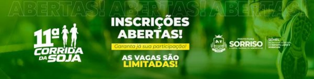A Prefeitura de Sorriso, por meio da Secretaria Municipal de Esporte, Lazer e Juventude (Semel), abriu as inscrições para a 11ª Corrida da Soja, que será realizada no dia 31 de maio, com largada às 6h, na Praça das Fontes.