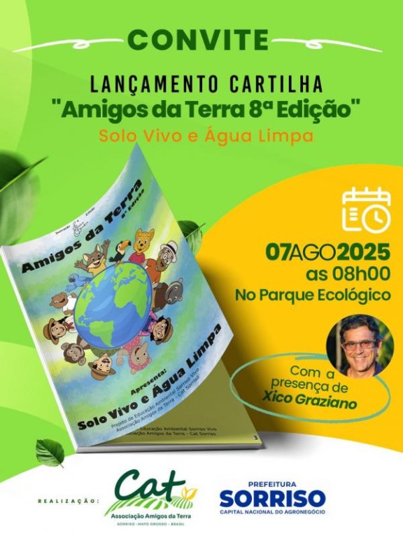 Durante o lançamento, está confirmada a participação do embaixador do CAT Sorriso, o engenheiro agrônomo Xico Graziano, que acompanhará as atividades com os estudantes. O material será distribuído nas escolas municipais e servirá como ferramenta pedagógica de apoio à educação ambiental e ao incentivo de boas práticas no campo.