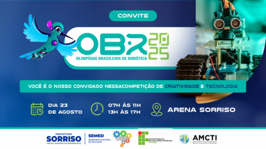 Sorriso sedia, no dia 23 de agosto, a etapa regional da Olimpíada Brasileira de Robótica (OBR), um dos maiores eventos educacionais voltados ao fomento da ciência e da tecnologia entre estudantes do ensino fundamental e médio. A competição será realizada na Arena Sorriso e acontece pela primeira vez no município.