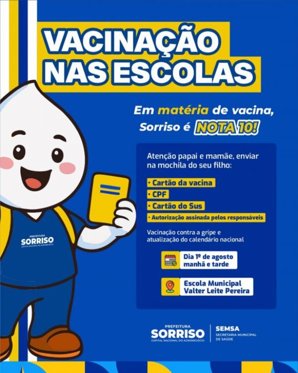 Resultado da parceria entre as Secretarias de Saúde e Educação, a ação está levando vacinação às escolas e Cemeis do MUnicípio com o tema “Em matéria de vacina, Sorriso é nota 10!”, garantindo mais saúde e proteção no ambiente escolar.