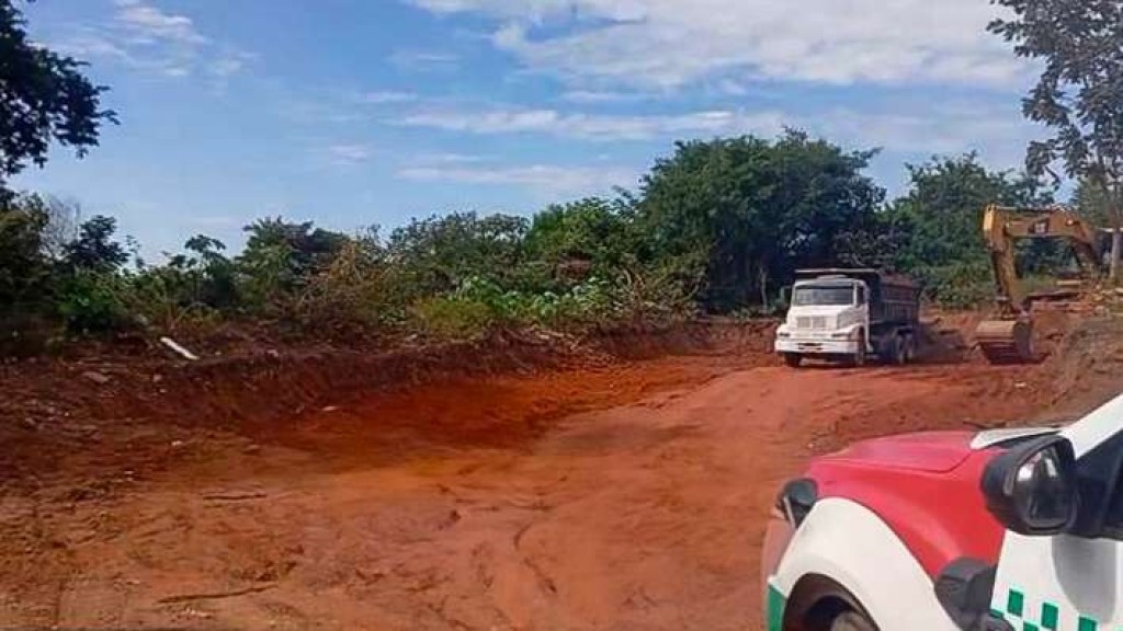 Dois homens foram flagrados retirando aterro do terreno. Eles utilizavam um caminhão-caçamba e uma retroescavadeira