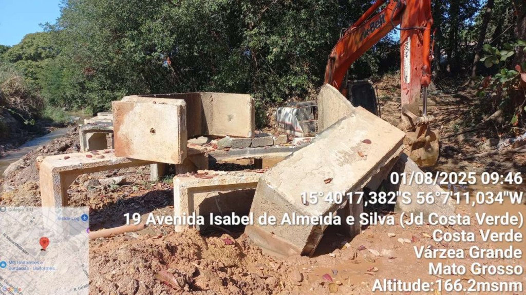 A Prefeitura de Várzea Grande informa que estão em andamento as obras na Avenida Elvira Monteiro, no bairro Costa Verde, para reconstrução da travessia sobre o córrego Água Limpa, com prazo estimado de 30 dias para conclusão.