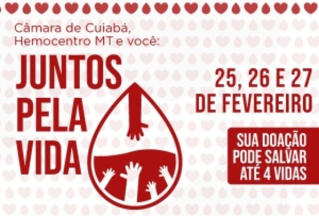 Nos dias 25, 26 e 27 de fevereiro, a Câmara Municipal de Cuiabá vai realizar&nbsp uma ação de doação de sangue em conjunto com o Hemocentro de Mato Grosso. Durante os três dias do projeto, a população cuiabana poderá ir até a Casa do Legislativo, onde um caminhão do Hemocentro estará das 8h às 17h realizando a coleta.