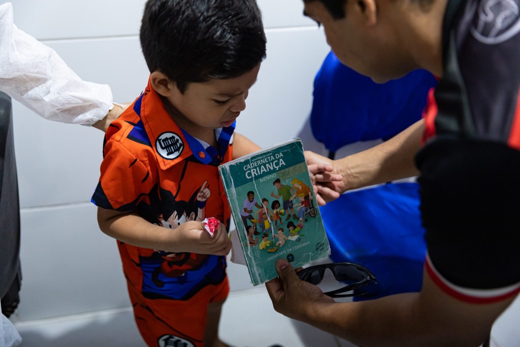 A imagem mostra uma criança vestindo roupas coloridas ao lado de um adulto. Ambos seguram uma caderneta de vacinação, que aparece em destaque na imagem.
