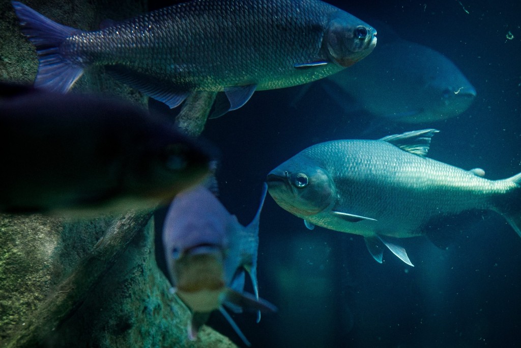 A foto mostra peixes do Aquário Municipal. O local abriga mais de 600 peixes, distribuídos em aproximadamente 22 espécies.