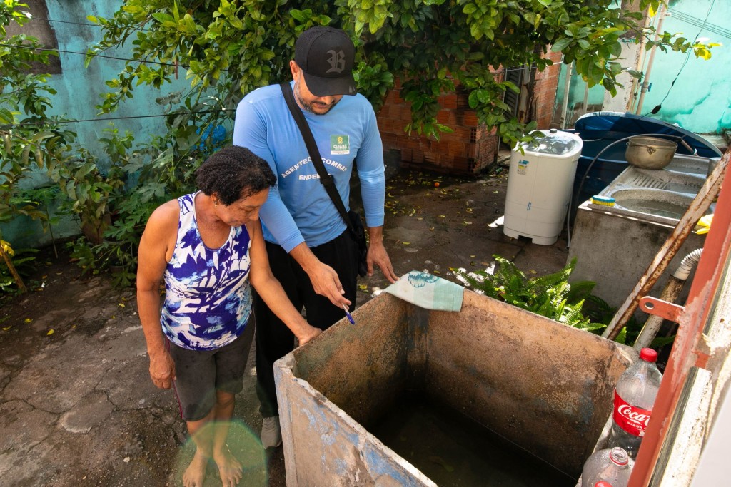 A imagem ilustra um agente de saúde durante uma visita domiciliar de fiscalização ao lado de uma moradora. O agente está uniformizado, e a moradora veste uma blusa branca com estampa azul. Ambos observam um depósito de água aberto.