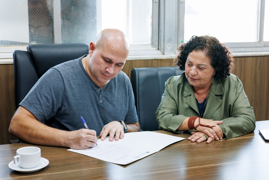A foto ilustra o prefeito Abilio Brunini sentado numa cadeira de almofada preta, apoiado numa mesa de madeira, assinando um papel à caneta. Trata-se de um homem careca que veste camisa cinza. Ao lado, está a vereadora Baixinha Giraldelli. Trata-se de uma mulher de cabelo encaracolado cuja mão está apoiada na outra.