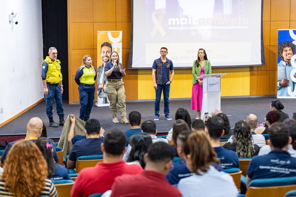 “A Campanha Maio Amarelo vem tratar com cada um de nós. Mais do que falar sobre as regras de trânsito, estamos aqui para falar sobre a vida. O slogan deste ano é claro: Desacelere, seu bem maior é a vida. Quando falamos em desacelerar, não nos referimos apenas à redução da velocidade no trânsito, mas a um movimento de mudança de comportamento. Estamos falando sobre a importância de refletirmos sobre as nossas atitudes no trânsito e a responsabilidade que temos em preservar vidas”, frisou a vice-prefeita e secretária Municipal de Mobilidade Urbana, coronel Vânia Rosa, durante o evento no auditório da Fecomércio.
