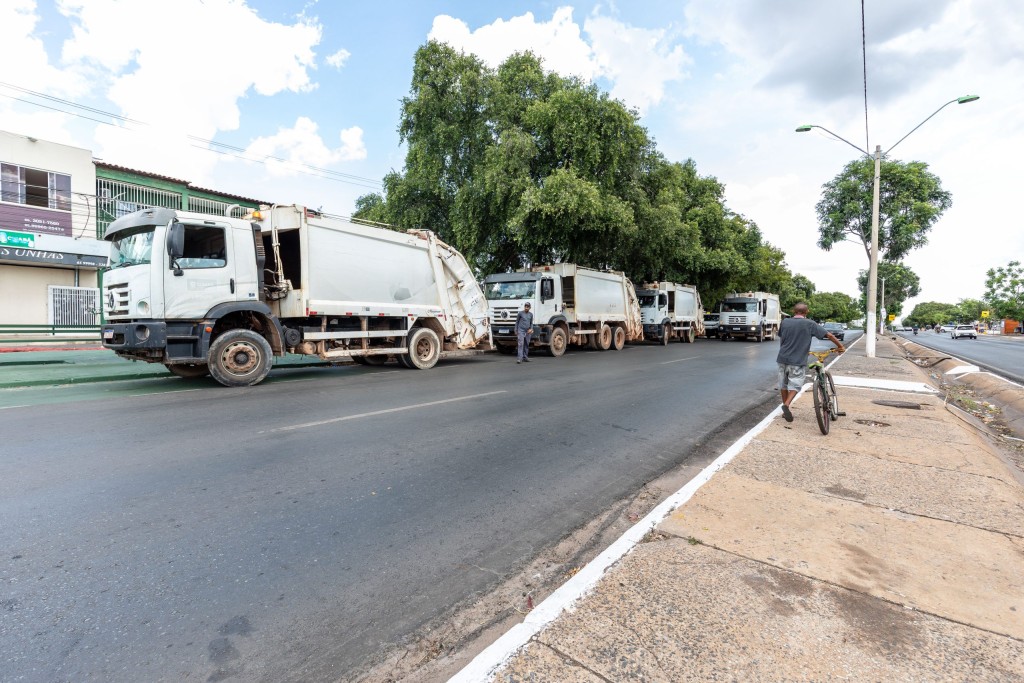 Caminhões coletores estão posicionados na Avenida Ulisses Guimarães, popularmente conhecida como Avenida Quatro Pistas, durante operação de regularização da coleta de lixo.