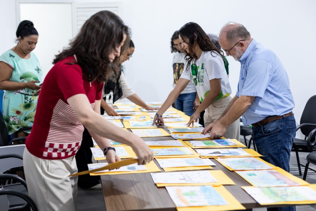 A foto mostra a comissão definindo os melhores desenhos do Concurso Água Viva que vão para a votação final do público. Todos os desenhos estão sobre uma mesa para avaliação dos integrantes da comissão.