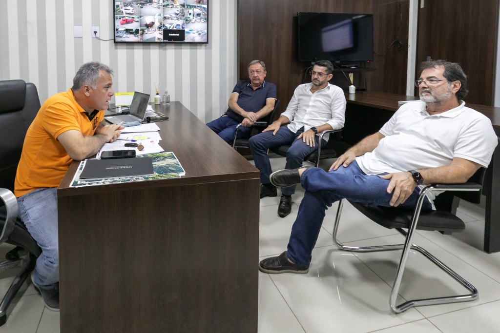 A imagem mostra o diretor-geral da Limpurb, Reginaldo Teixeira, em uma reunião com três representantes da Somatem. Os participantes da conversa estão em uma sala fechada, sentados em torno de uma mesa de madeira.