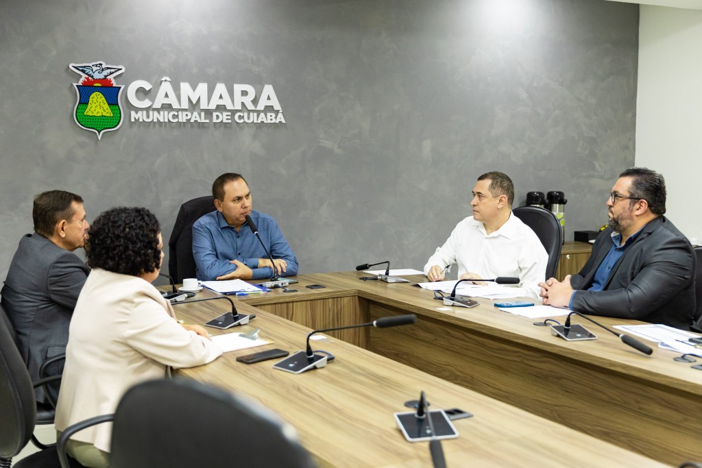 A foto ilustra o secretário de Economia, Marcelo Bussiki, vestido de camisa branca e sentado numa cadeira preta. Ao lado, está o Controlador Geral do Município, Wesley Bucco, vestido com traje social. Ambos estão apoiados numa mesa de madeira. Também estão sentados, do lado esquerda, a vereadora Baixinha Giraldelli e o vereador Demilson Nogueira. No centro, está o vereador Dilemário Alencar, vestido de camisa social azul e falando ao microfone. No fundo, se vê uma parece com letra forma e logotipo da Câmara Municipal de Cuiabá.