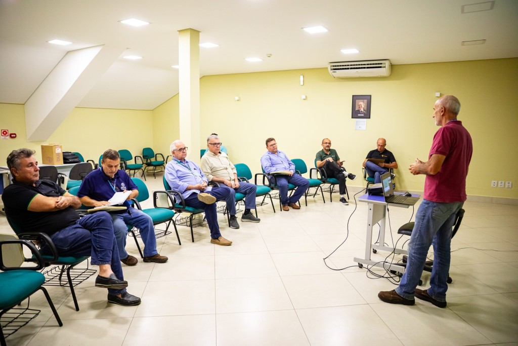 A foto mostra os participantes da reunião sentados enquanto um palestrante em pé faz as apresentações. O ambiente é bem iluminado e espaço amplo.