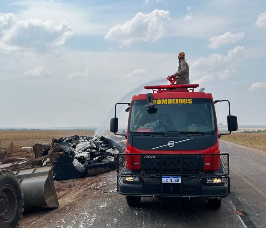 Bombeiros militares combatem incêndio em caminhão carregado de plumas de algodão