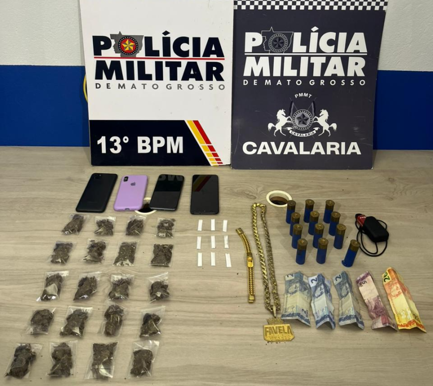 No local, as equipes localizaram 20 porções de maconha, três aparelhos celulares e R$ 100 em espécie. A esposa do suspeito também foi abordada manuseando os entorpecentes. Ambos foram conduzidos à delegacia.