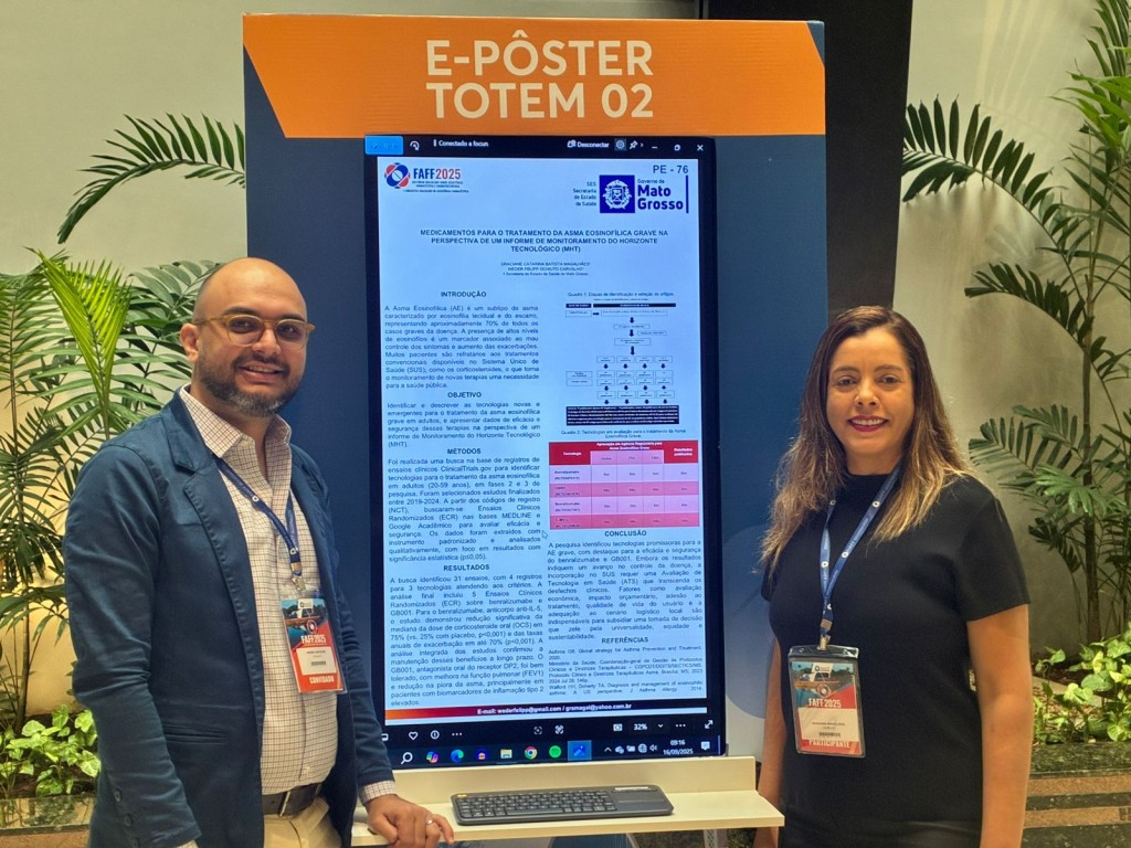 Carvalho é o autor principal do estudo, intitulado “Medicamentos para o Tratamento da Asma Eosinofílica Grave na Perspectiva de um Informe de Monitoramento do Horizonte Tecnológico (MHT)”, em coautoria com Graciane. O trabalho iniciou na especialização em Avaliação de Tecnologias em Saúde da Escola de Saúde Pública de MT, vinculada à SES.