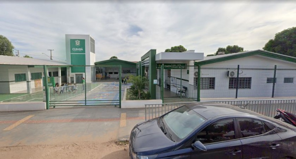 #PraTodosVerem: A imagem mostra a fachada da escola em que será realizado o mutirão, em Cuiabá, identificada pelo brasão e nome da cidade em uma torre verde localizada à esquerda. O espaço é cercado por grades e conta com uma quadra poliesportiva logo na entrada, onde há algumas mesas e cadeiras dispostas. À direita, aparecem prédios de estrutura simples, pintados de branco com detalhes em verde, com janelas e aparelhos de ar-condicionado. Em frente ao local, na rua, há um carro estacionado e parte de uma motocicleta visível.