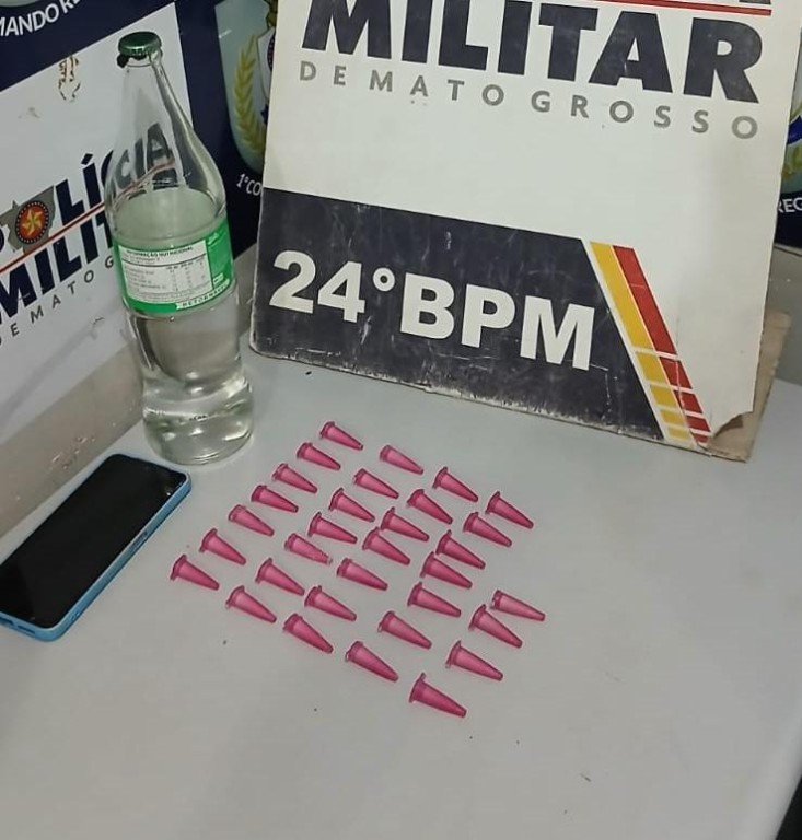 Policiais militares do 24º Batalhão apreenderam, na noite desta terça-feira (30.9), 32 porções de substância análoga à cocaína, um frasco de “loló” e prenderam um jovem de 19 anos, suspeito de tráfico ilícito de drogas, no bairro Pedra 90, em Cuiabá. As equipes encontraram alguns entorpecentes escondidos na roupa íntima do suspeito.