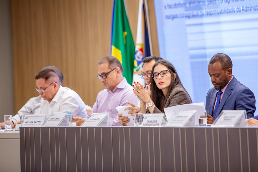Deputados estaduais participaram da reunião de instalação de Mesa Técnica para discutir o superendividamento do funcionalismo público estadual no Tribunal de Contas do Estado (TCE) na tarde de segunda-feira (26). O objetivo é trabalhar numa proposta de regulamentação com mais regras para concessão e controle de empréstimos e cartões consignados. Estiveram presentes Paulo Araújo (PP), Eduardo Botelho (União), Wilson Santos (PSD), Lúdio Cabral (PT), Henrique Lopes (PT) e Janaina Riva (MDB).