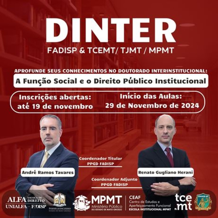 Descrição da imagem: peça publicitária colorida e quadrada de uma biblioteca ao fundo, com dois homens em pé em primeiro plano. Texto: Dinter. Fadisp & TCEMT/TJMT/MPTT. Aprofunde seus conhecimentos no doutorado interinstitucional: a função social e o direito público institucional. Inscrições abertas: até 19 de novembro. Início das aulas: 29 de novembro de 2024. Coordenador titular PPGD-FADISP. Ao final, logos da Fadisp, Judiciário, MPPT, Ceaf, TCEMT e Esmagis-MT.