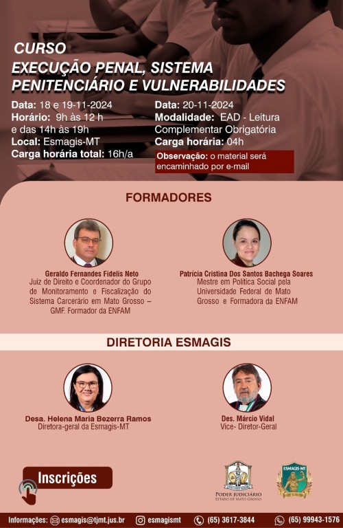 A Escola Superior da Magistratura de Mato Grosso (Esmagis-MT) informa que estão abertas as inscrições para o curso de formação continuada ‘Execução Penal, Sistema Penitenciário e Vulnerabilidades’, que será ofertado presencialmente nos dias 18 e 19 de novembro e na modalidade EAD no dia 20 de novembro.