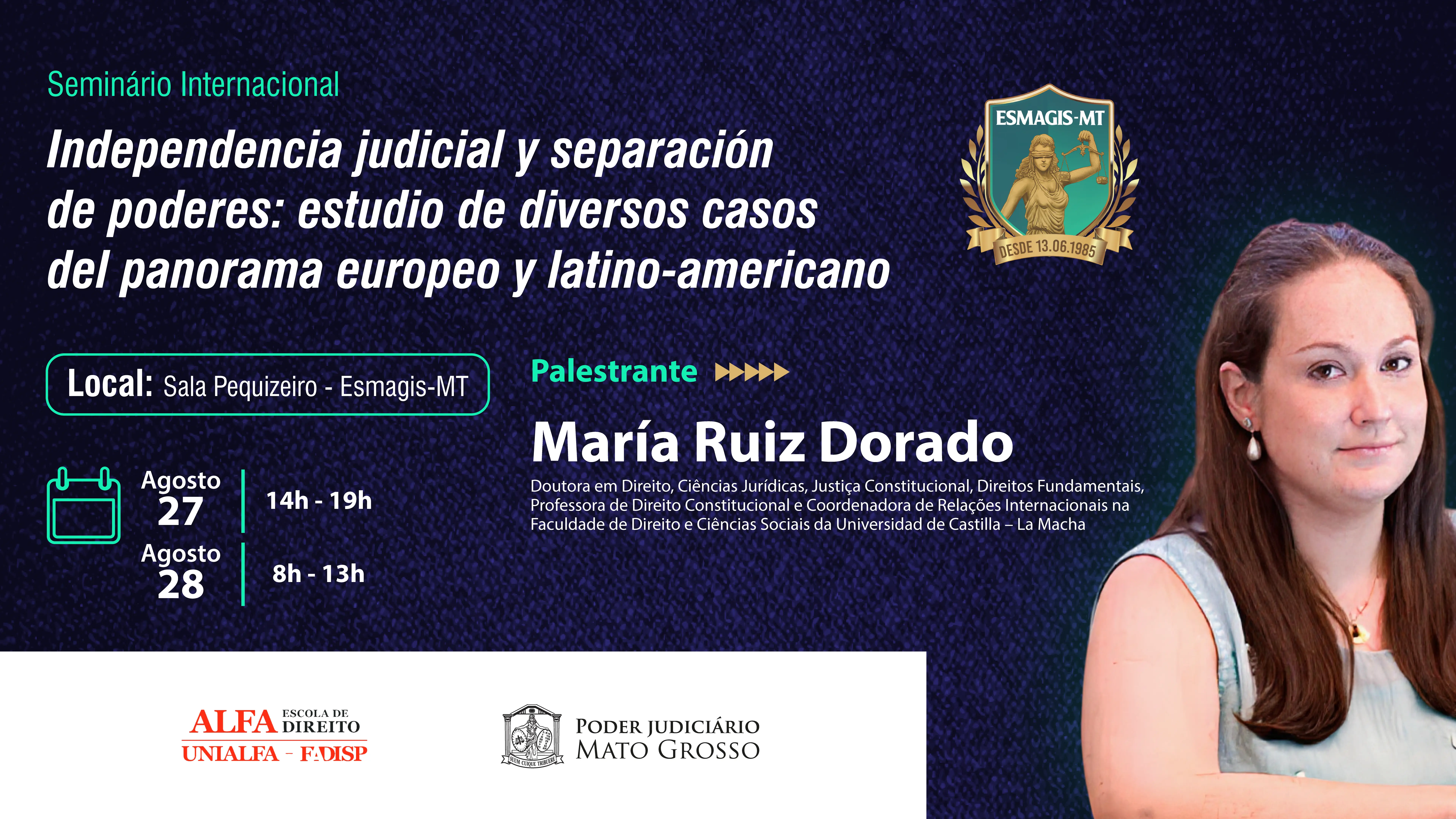 Um dos destaques do evento será a palestra da Professora Doutora María Ruiz Dorado, professora de Direito Constitucional e coordenadora de Relações Internacionais na Faculdade de Direito e Ciências Sociais da Universidad de Castilla – La Mancha. Ela tem doutorado em Direito, com menção internacional pela Universidad de Castilla e doutorado em Ciências Jurídicas, Justiça Constitucional e Direitos Fundamentais sob supervisão conjunta da Universidade de Pisa (Prêmio Extraordinário para o melhor doutorado da Universidade de Castilla).