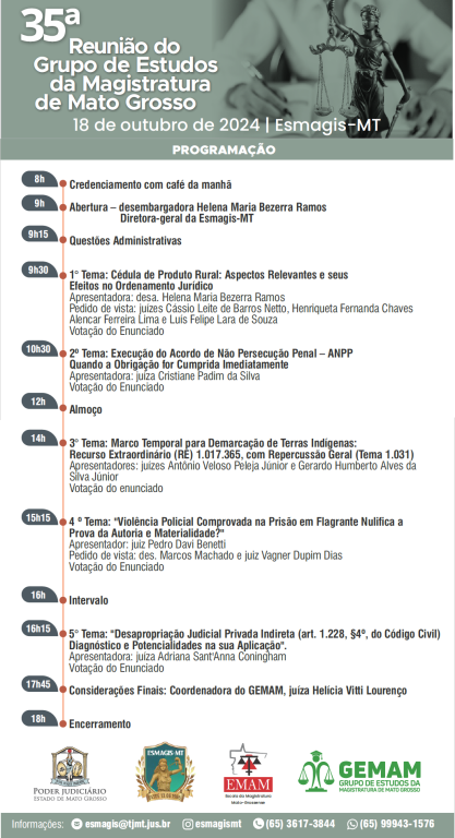 Demarcação de Terras Indígenas, Acordo de Não Persecução Penal e Violência Policial na Prisão em Flagrante, são alguns dos temas que serão discutidos durante a realização a 35ª Reunião do Grupo de Estudos da Magistratura de Mato Grosso. Eles se reunirão na sexta-feira (18 de outubro), a partir das 8h, presencialmente, na Escola Superior da Magistratura de Mato Grosso, ou na forma on-line, pela Plataforma Microsoft Teams.
