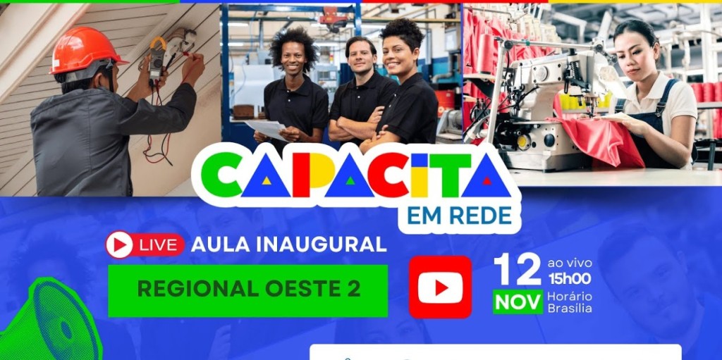 Esta matéria possui recursos de texto alternativo para promover a inclusão das pessoas com deficiência visual. Imagem 1: A imagem é um pôster promocional de um evento ao vivo intitulado “Aula Inaugural” para “Regional Oeste 2”. Apresenta o texto “Capacita em Rede” em destaque. O evento está marcado para o dia 12 de novembro, às 15h, horário de Brasília. O lado direito da imagem mostra três pessoas envolvidas em atividades diferentes. No topo, uma pessoa usando um capacete vermelho está usando um martelo. Abaixo, duas pessoas estão juntas, com o rosto de uma pessoa borrado. Na parte inferior, uma pessoa está operando uma máquina de costura com tecido vermelho. O design geral inclui elementos que indicam uma transmissão ao vivo, como um ícone de botão de reprodução e a palavra “AO VIVO”.